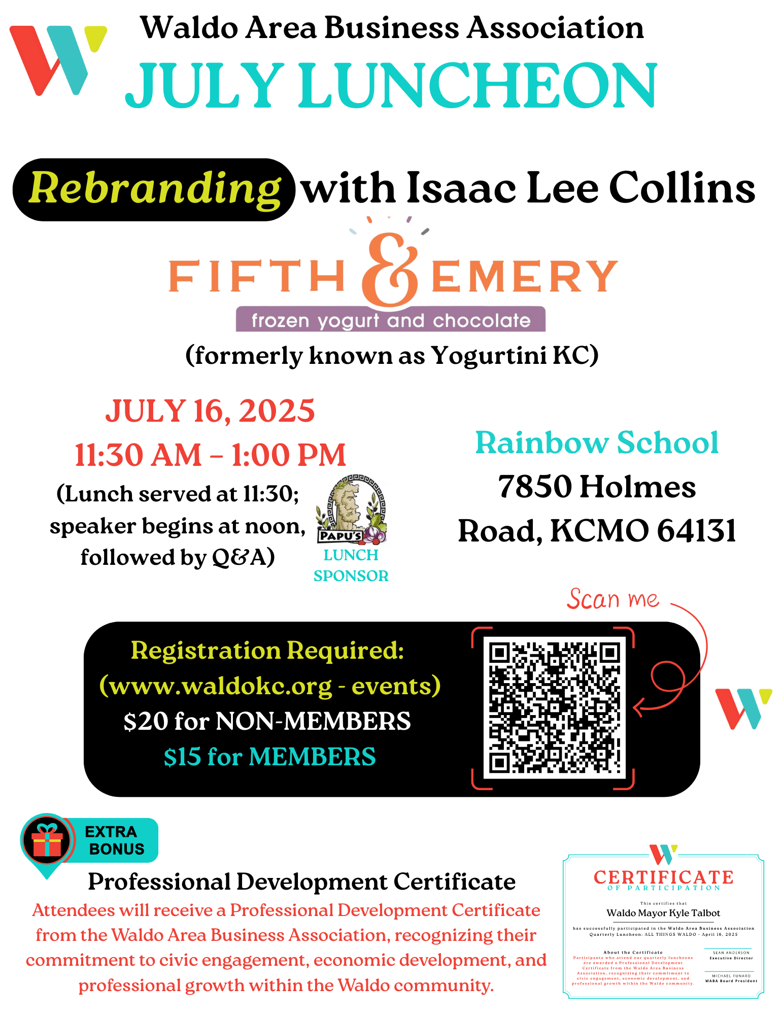 Event Description: We hope you will join us in July for our quarterly luncheon at Rainbow School. We will discuss a memorable rebranding journey with Isaac Lee Collins, owner of Fifth & Emery Frozen Yogurt & Chocolate (formerly known as Yogurtini KC). Bring a friend!
